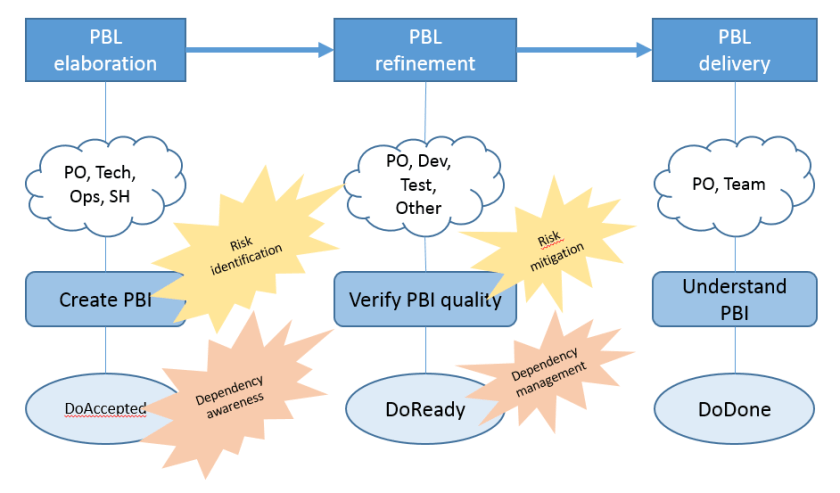 The elaboration of the PBL is about describing the product functionalities from a consumer or user point of view, and about capturing stakeholder requirements. This allows the shaping of the product roadmap and the potential risks it implies, as well as the potential dependencies that become apparent. Breaking down value epics into functional features and then user stories allows a first visualization and planning on how value is to be delivered to the market. The first completion definition is provided by a set of criteria that define if a backlog item is valuable, feasible and usable. User story mapping is a useful technique for this stage.