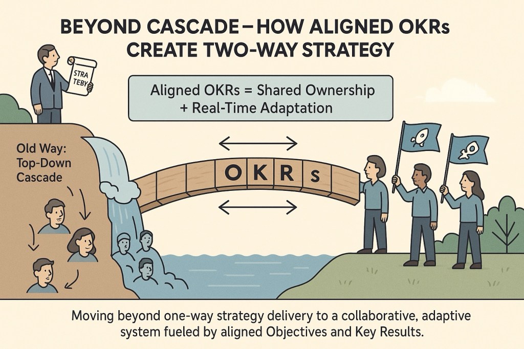 Most organizations get OKRs wrong. They create elaborate cascading hierarchies where executives set quarterly targets that flow down through management layers, eventually landing on individual teams as predetermined objectives. This top-down approach treats strategy as a one-way street—leadership thinks, teams execute.